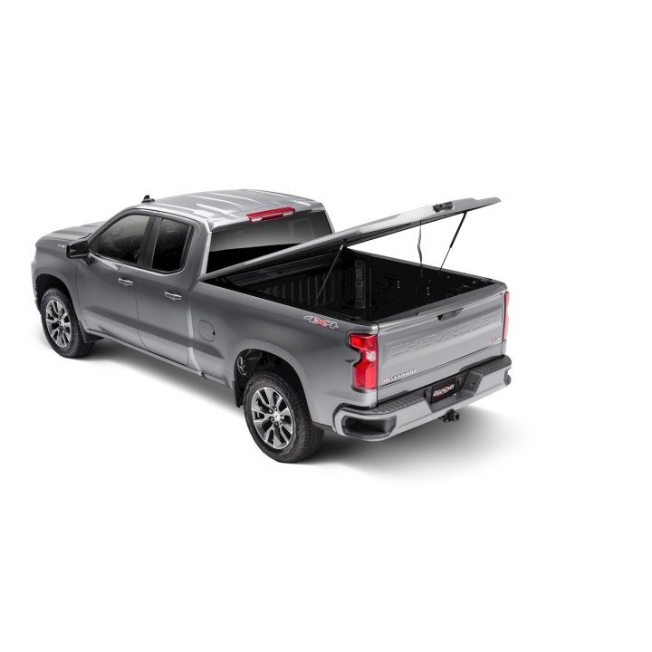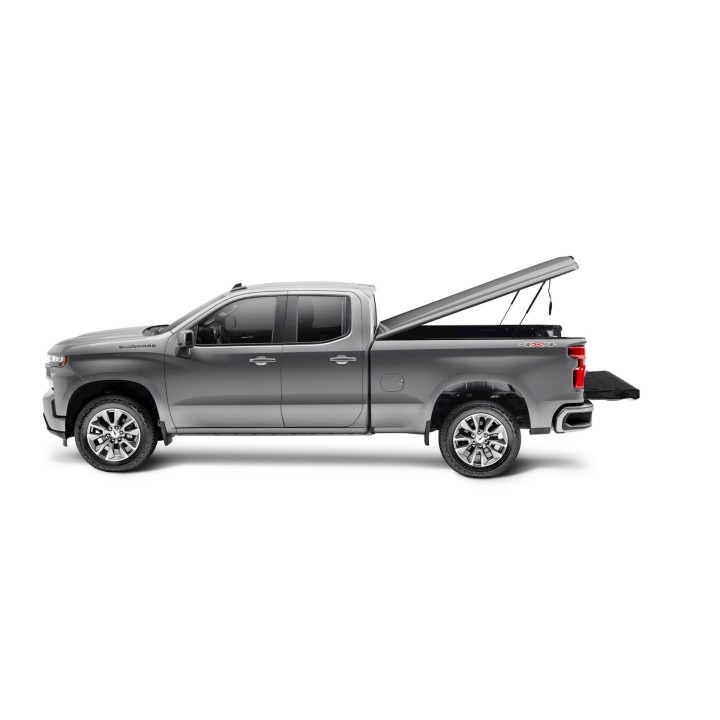 The Undercover Elite LX is the high-end tonneau cover. The Elite Lx has features like an interior carpet, a cargo retriever hook, and a removable LED light.