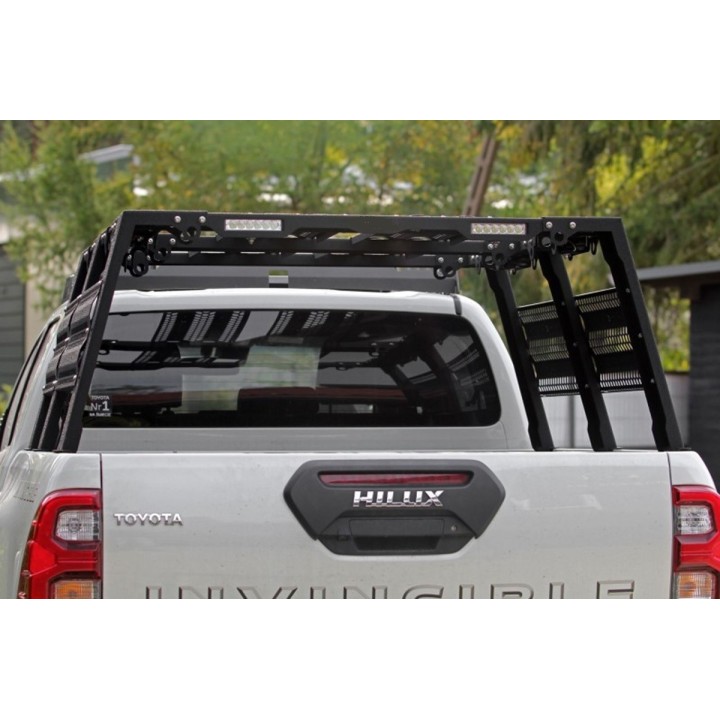 The high version of this bed rack allows for mounting a roof tent but also accessories on the sides of the rack thanks to the side plates.