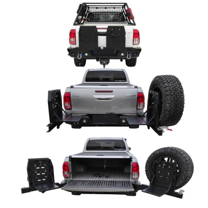 The set consists of 2 arms opening to the sides of the vehicle, suitable for mounting a spare wheel, and accessories: a hilift or jerry cans,
