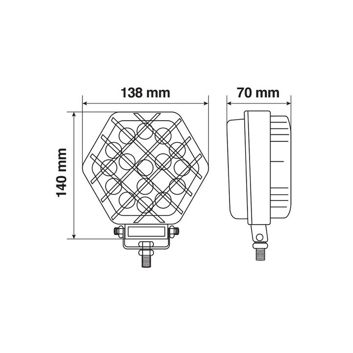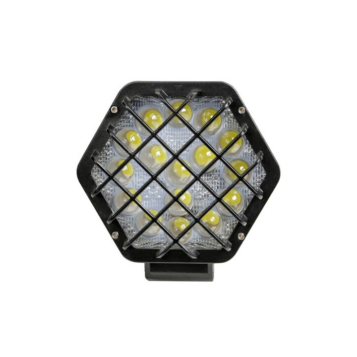 Protection grille, aluminum structure, IP67 waterproof. Adjustable tilt mounting bracket with screws provided. Focused light of 52W, 6,000°K - 2400 lumen.