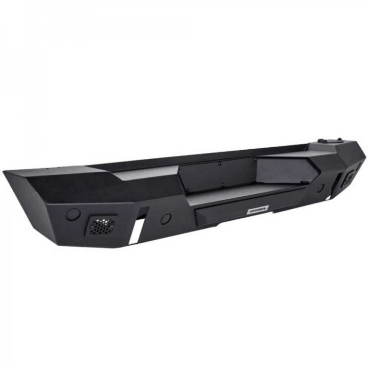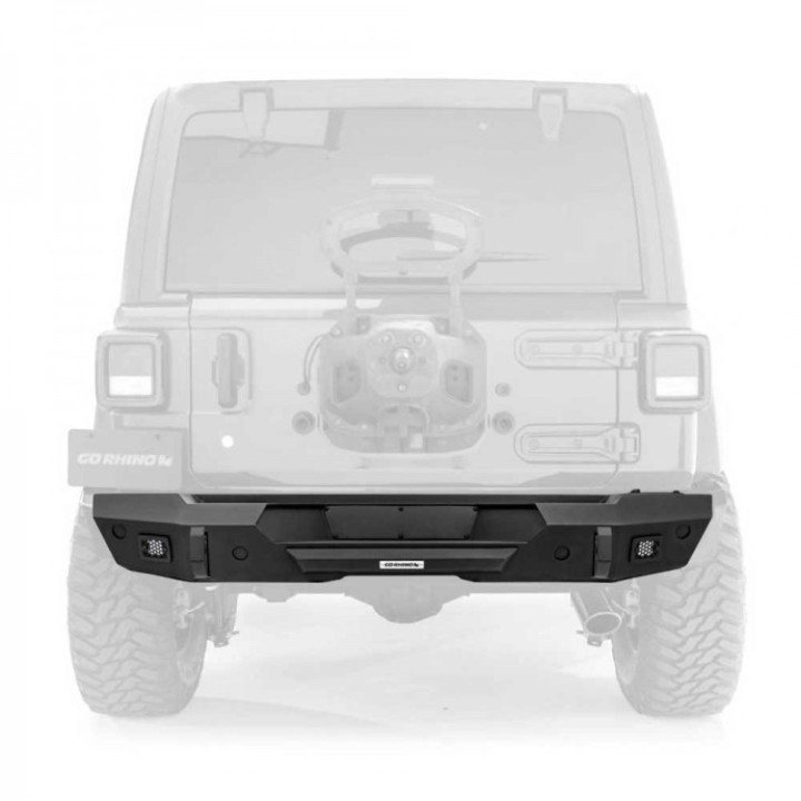 One-piece Trailline rear bumper for Jeep Wrangler JL models. Features a wrap-around end cap for improved access to overhead racks. Features a ground clearance end cap for use with larger tires and lifted vehicles. Patented shackle mounts for Signature Rhino hook included. Black powder coat finish.