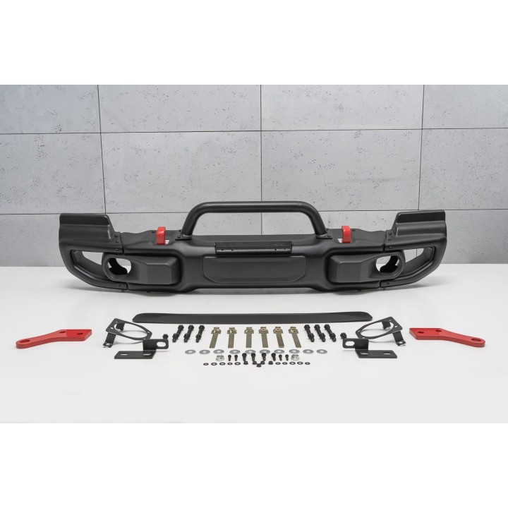 improve the approach angle. The bumper has a slot and a plate for mounting an electric winch,
