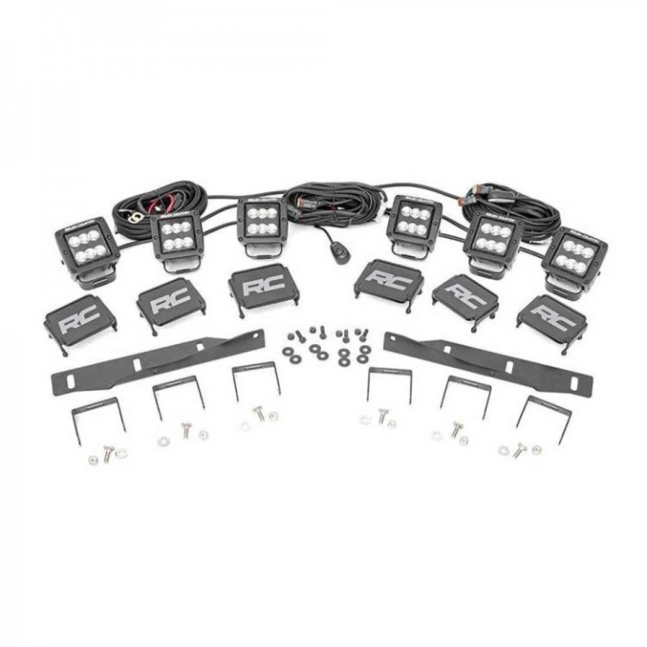 Bring the cutting-edge power and efficiency of LED lighting to your Ford Raptor with Rough Country's 2-inch triple fog light LED kit. This clever bracket and LED combination allows you to insert three pairs of Rough Country's 2" LED cubes into the factory front bumper opening, providing increased lighting and a great look that blends seamlessly with the Raptor's aggressive design. The easy-to-install mounting brackets feature a 100% bolt-on installation process and can be done with common tools in no time. Each kit includes an optional IP68 waterproof, flat-wound braided wiring harness with a toggle switch and in-line fuse, or you can connect them directly to the factory switches for an OEM look. This kit includes 3 pairs of Rough Country's popular 2-inch black series LED cubes, offering a total of 8,640 lumens and 108 watts of forward-facing LED power.