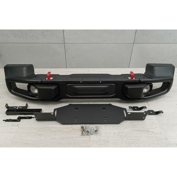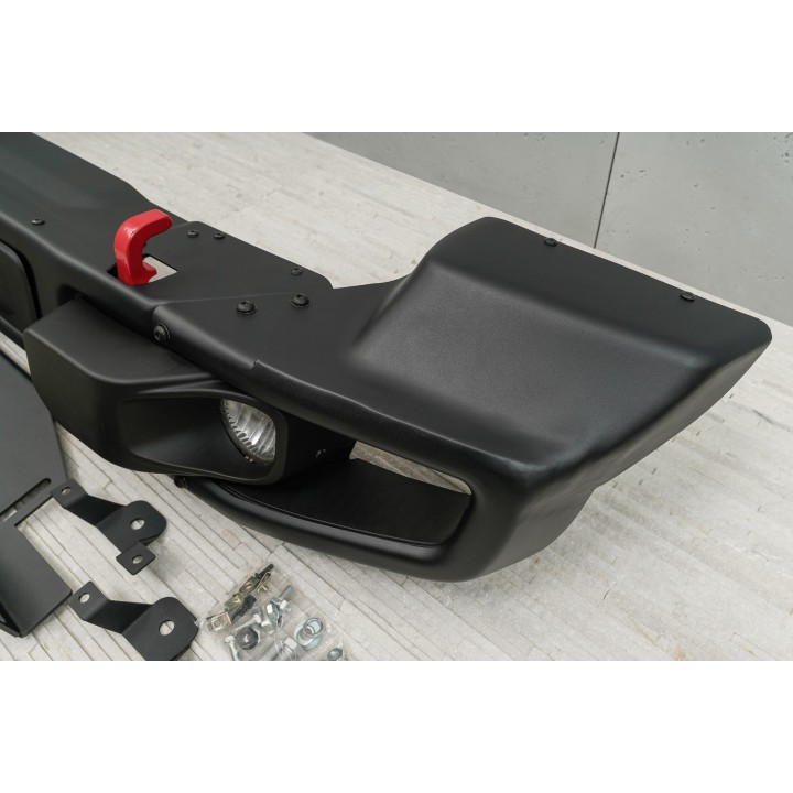 It's a modular bumper; On the side, the steel elements are removable, which allows to increase ground clearance and improve the approach angle. The bumper has a mounting location and a plate for an electric winch, red towing hooks for shackles, a tilting license plate holder, metal frames for fog lights, an additional support for work lamps and a set of halogens.