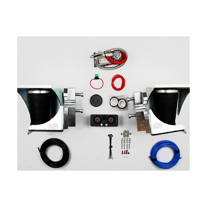 Dual-circuit compressor kit: it includes additional mounting hardware (air hose, T-fittings, etc.), a 45-liter compressor, and a dual control panel in the cabin, allowing easy control of the air springs from the cabin. Both bellows can be inflated independently to maximum pressure and deflated to minimum pressure. This allows balancing different loads and ensuring vehicle stability in corners.