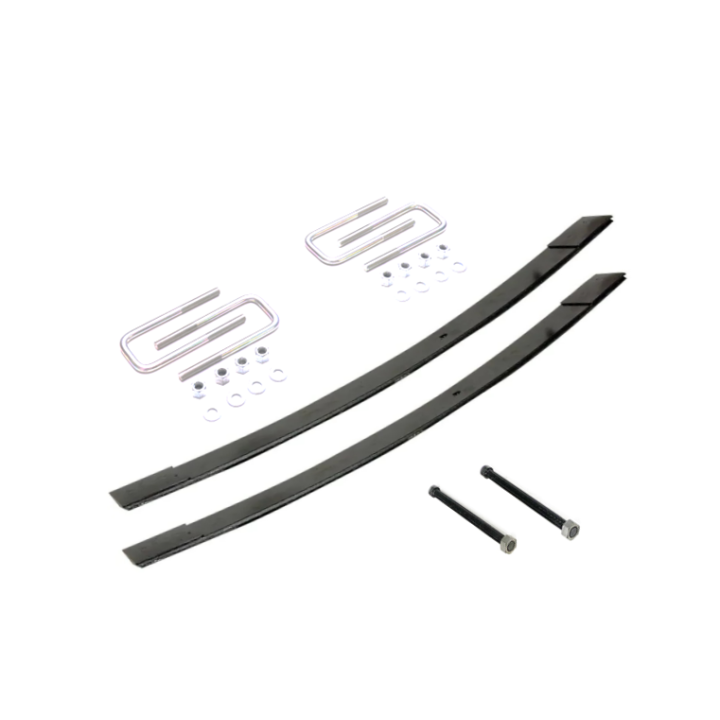 Le kit comprend : Lames à ressort : 2 / Boulons en U avec écrous : 4 / Boulons centraux prolongés : 2