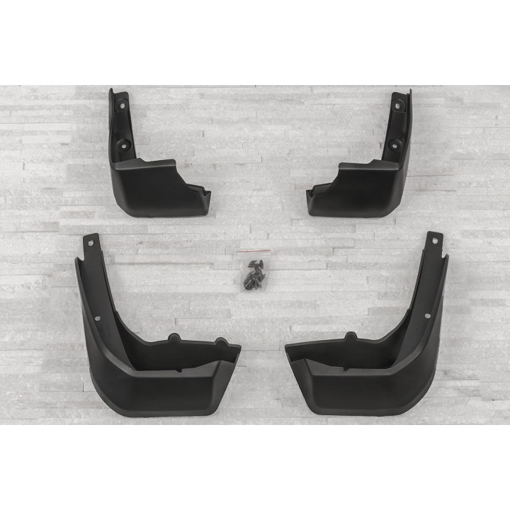 The set includes a set of 4 mud flaps as well as its fastening system .