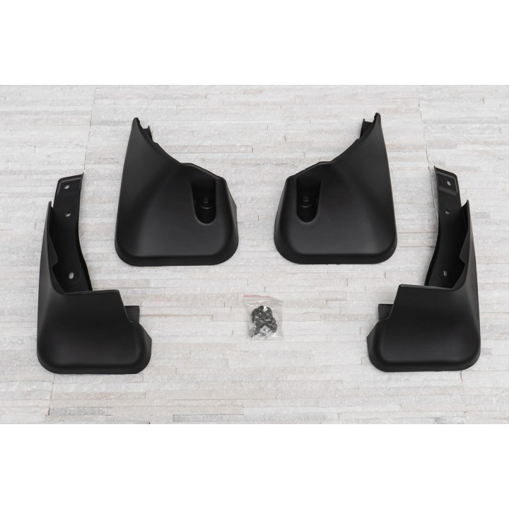 The set includes a set of 4 mud flaps as well as its fastening system .