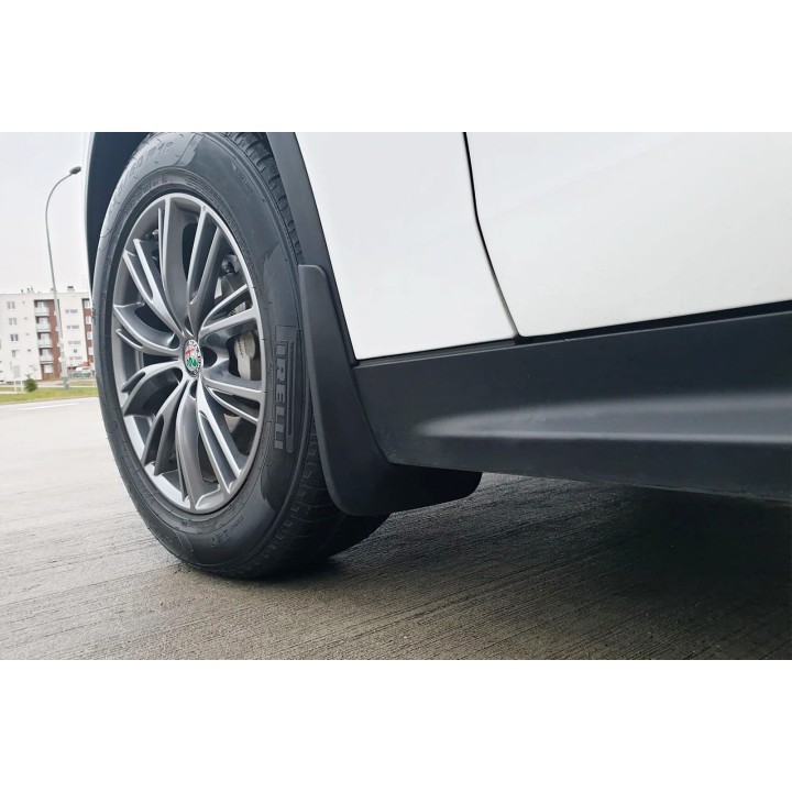 These specific mud flaps are designed to blend perfectly with the car's exterior line. They effectively protect the sides of the car against stone splashes from under the wheels and reduce the amount of water sprayed on cars driving behind. They are made of high-quality plastic, ensuring adequate flexibility, durability, and aesthetic appearance of the product for a long period of use.