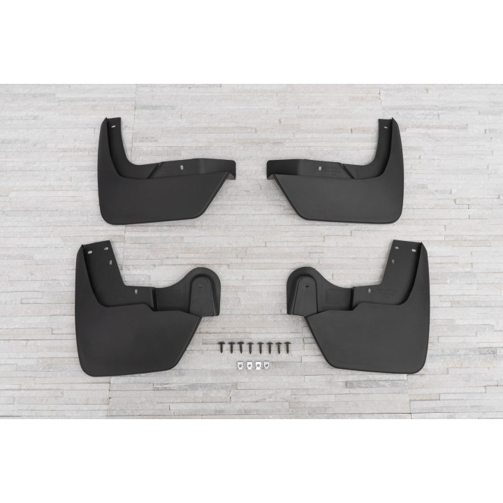 The set includes a set of 4 mud flaps and their fastening system .