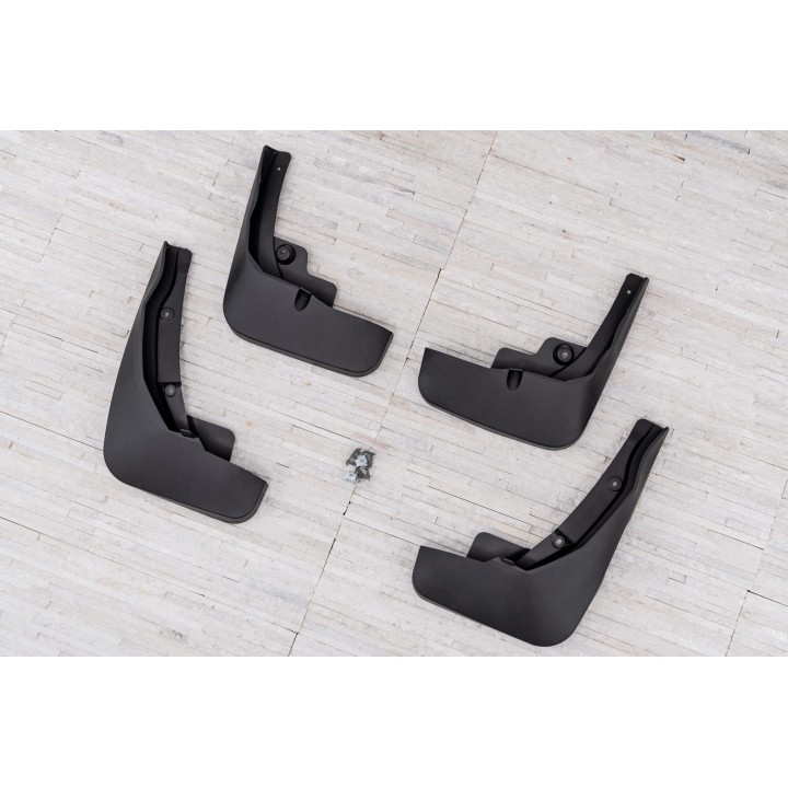The set includes a set of 4 mud flaps as well as its fastening system .