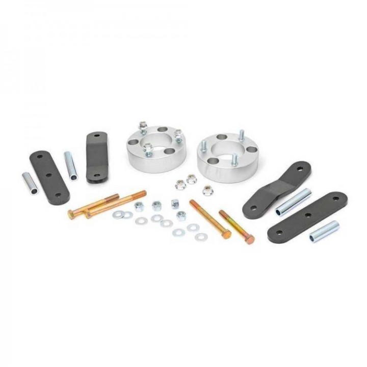 Get greater ride height and a great look at an incredible price with Rough Country's 5 cm lift kit. This kit is ultra-easy to install! A set of strut spacers attaches to the top of the strut, with no strut disassembly required, which makes the process considerably smoother! A set of 3/8" steel plate shackles is also included, designed to preserve factory ride quality and reduce drivetrain vibrations. These heavy-duty shackles provide easy and effective lift height, while their robust design and powder coat finish are durable enough to withstand the elements.
