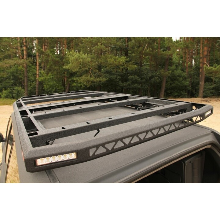 The platform consists of two parts, it is flat on top and suitable for mounting roof tents. On the upper surface, the off-road roof rack has holes to facilitate the installation of luggage nets and the screwing of any individual support.
