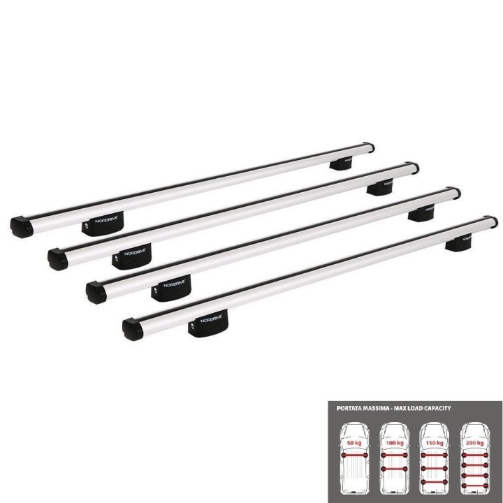The loading capacity is 50 kgs per roof bar, for a total of 200 kgs for four bars (subject to the maximum load supported by the vehicle - refer to the manufacturer's manual).