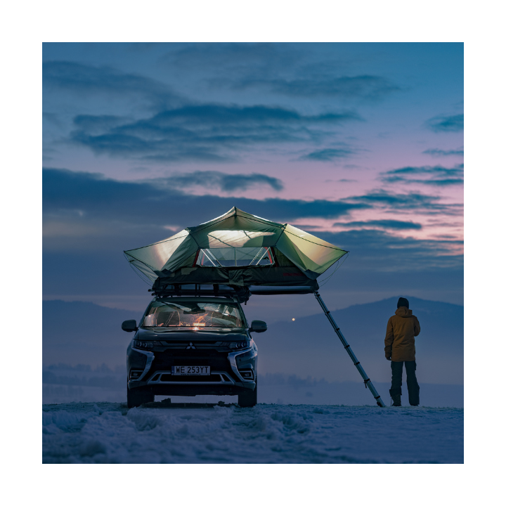 This roof tent will be the true heart of your mobile base camp, in all seasons. The tent body benefits from a robust construction in ripstop polyester and a waterproof coating. Its frame is made of aluminum, making it light yet strong. By adding a rainfly, it will offer real protection against bad weather. Ultra-wide windows and doors offer magnificent views and excellent ventilation, especially with its mesh panel which, if you're not sleeping, will allow you to count the stars. Its thick foam mattress (64 mm) covering the entire floor ensures cozy comfort all night long. It has a removable cover for easy cleaning. Can accommodate up to three campers. Ropes and D-rings on the tent floor will allow you to hang belongings or tie down the tent in case of wind. Adjustment points are at mid-height of the ladder, for easy installation. The easy-to-deploy design requires less effort and leaves more time to enjoy, practical in the dark or when it rains. There is an automatic ladder closing function which allows for easy closing. Tool-free vehicle mounting and lockable, easy to install and quick to fold.