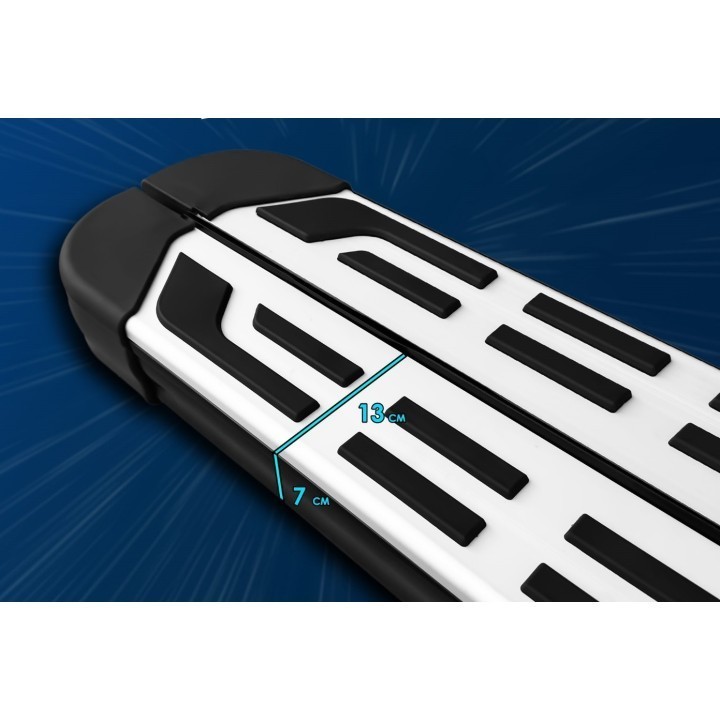 Running boards are wide aluminum plates with a profiled top. This ensures maximum slip resistance and helps you get into your vehicle safely.