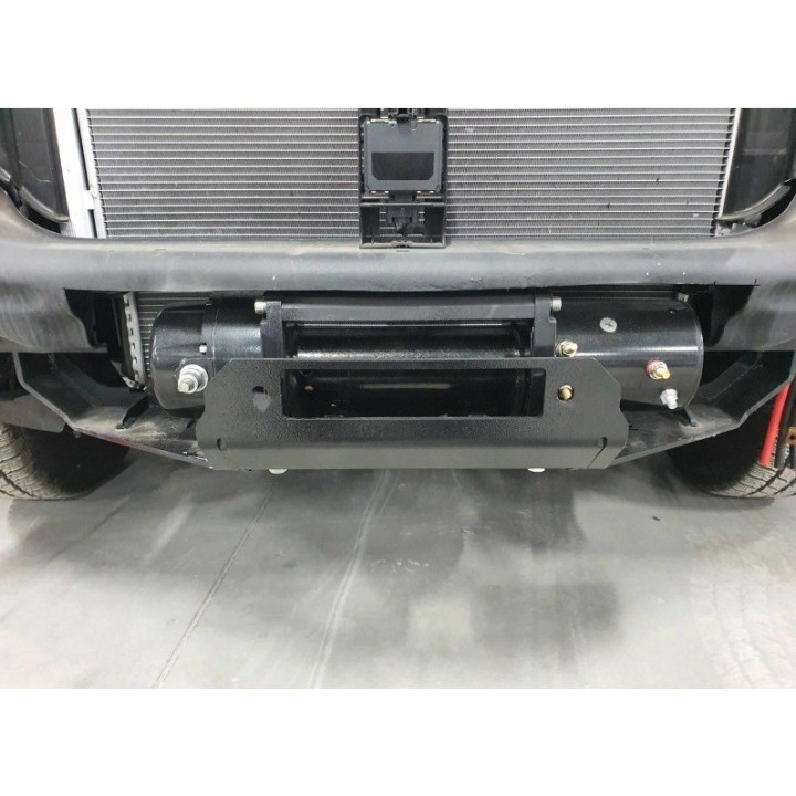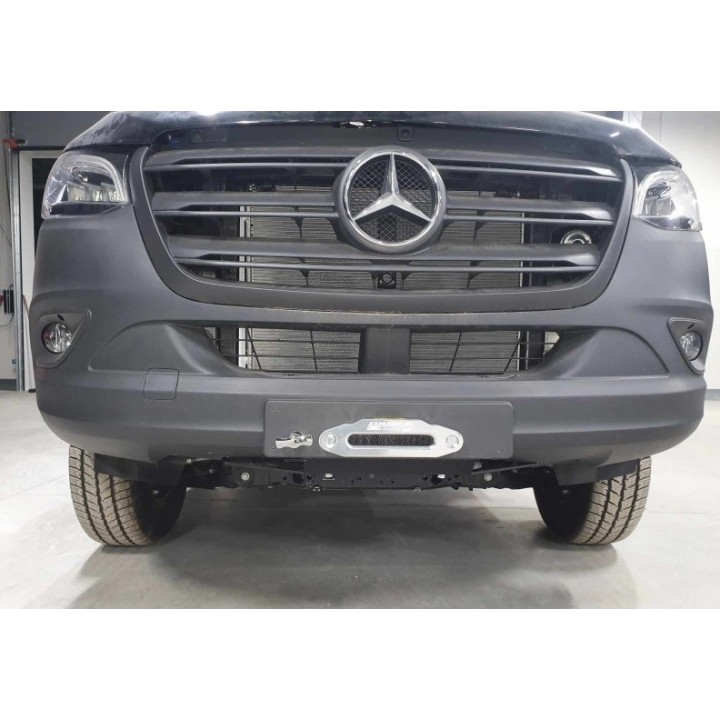 Mercedes Sprinter W907 VS30 2.0d 2021- Winch mounting plate 4X2 RWD under the factory bumper. Bolted to the vehicle's chassis rails. Manufactured as a single welded unit. Without any screw-on components. This allowed for high rigidity and low weight of this product. Assembly requires drilling 8 holes from below at the ends of the chassis rails. Made of 6 mm thick structural steel sheet. Shot-blasted and powder-coated using double-layer technology with texture. With a cutout under the winch drum to facilitate the removal of dirt from the cable. Weight approx. 14.1 kg.
