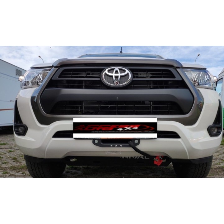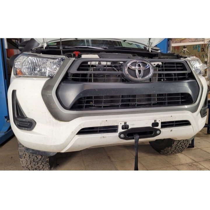Toyota Hilux SR5 2021 - hidden winch mounting plate up to 6000 kgs under the original bumper. Installation requires no welding or drilling. Bolts into factory frame holes. A winch height not exceeding 170 mm can be installed. Made of 6 mm thick structural steel sheet. Shot-blasted and powder-coated with double-layer textured technology. Weight approx. 14.2 kg.