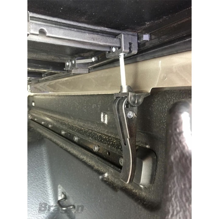 La lona semirrígida de PVC se puede enrollar en 3 sencillos pasos: suelte los pestillos, enrolle la lona hacia la cabina, fije la tela enrollada con las correas.