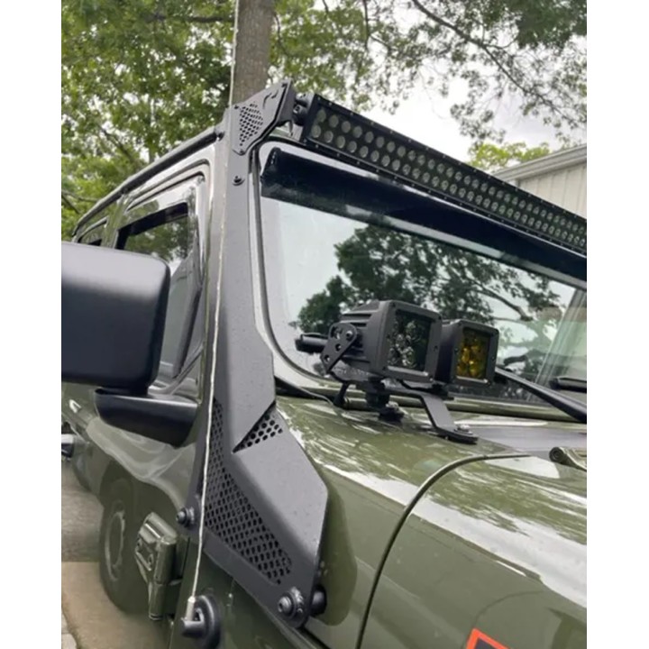 Los robustos soportes se montan directamente en el pilar A del Jeep, mientras que el diseño de perfil bajo aumenta la estabilidad.