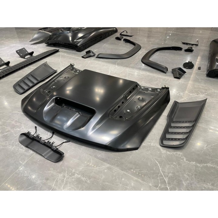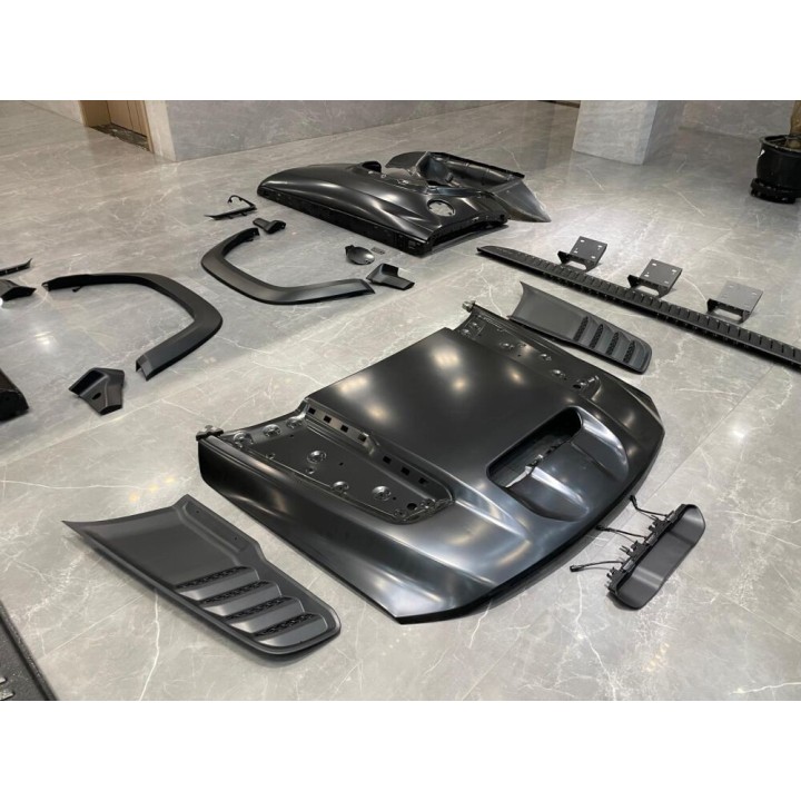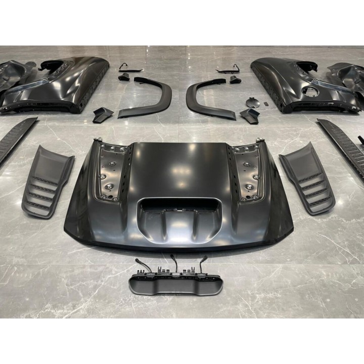 Kit completo: incluye todos los componentes esenciales para una conversión completa en un solo paquete, incluyendo el capó, el parachoques delantero, los faros, los ensanchadores de guardabarros, los estribos laterales y las luces traseras.