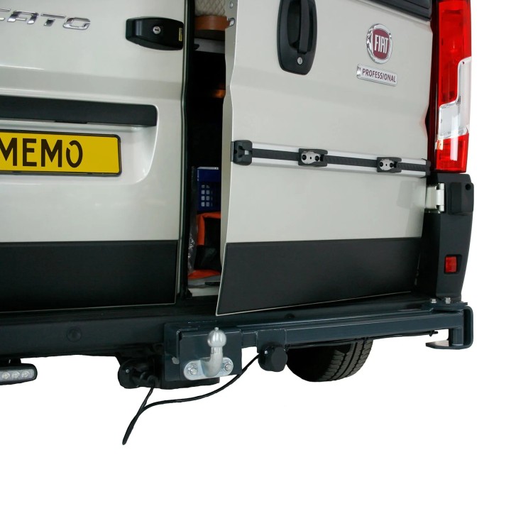 Debido a que el módulo se coloca encima del enganche, el portabicicletas está a la altura de las rodillas, lo que es ideal para bicicletas que no necesitan ser levantadas alto. Debido al uso de los puntos de fijación existentes, no es necesario realizar ninguna modificación en el propio vehículo. El módulo es adecuado para todos los modelos Ducato a partir de 2006. Bajo pedido, también puede adquirir el módulo para Volkswagen T5 y T6, Renault Master de 2003 a 2010 y Ford Transit Custom a partir de 2014. En este caso, simplemente contáctenos. El VAN-Swing se entrega con una toma de 13 pines integrada para extender la toma existente. Actualmente, el Van-Swing solo se puede pedir en negro.