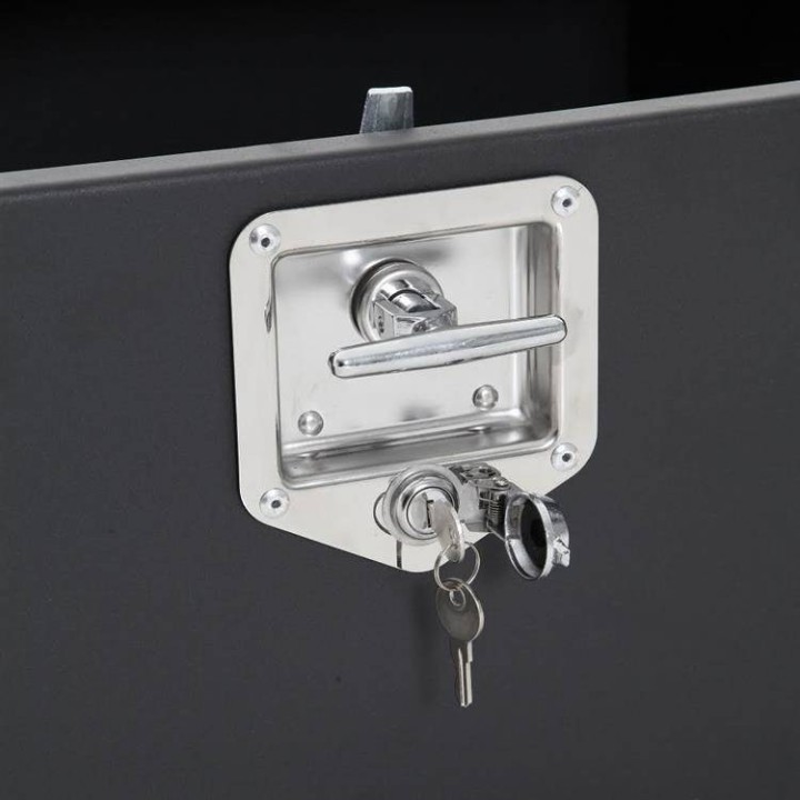 Esta caja de almacenamiento específica está fabricada en acero laminado en frío de calibre 16 y recubierta con una doble capa de pintura en polvo negra.