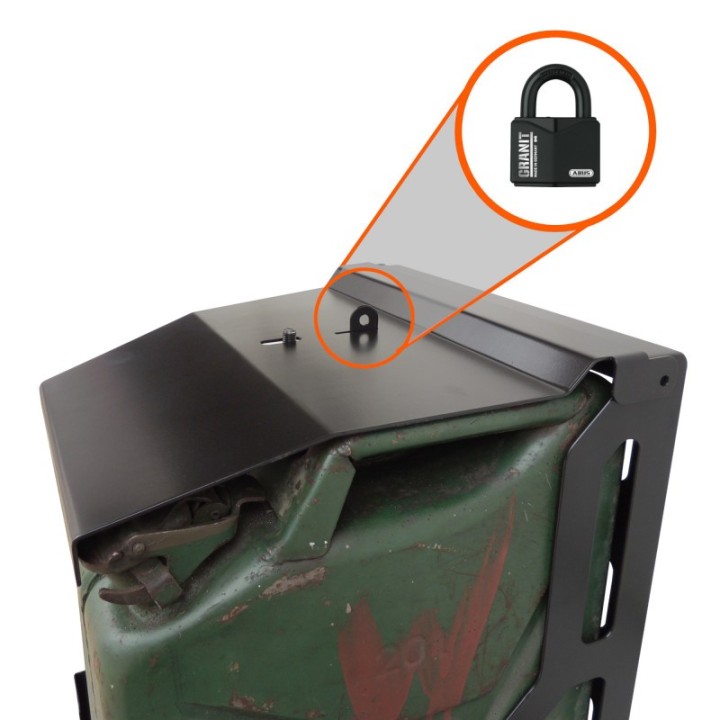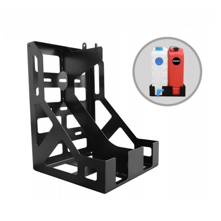 Soporte universal para 2 bidones estándar de 20 litros, de metal o plástico. Está diseñado para montar bidones con un grifo inferior (por ejemplo, un bidón de agua). Dispone de una solapa cerrada con candado.