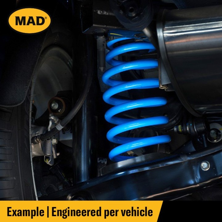 Este kit de suspensión eleva la parte trasera del vehículo de 10 a 20 mm, aumentando así la distancia al suelo y mejorando su estética. Los muelles son progresivos y se endurecen con el aumento de la carga. Todos los productos MAD están homologados por TÜV y probados; no afectan a otros componentes del vehículo. Este kit es ideal para conductores que transportan una carga constante superior a 150 kg. Con la carga máxima autorizada, el vehículo mantiene su altura original.