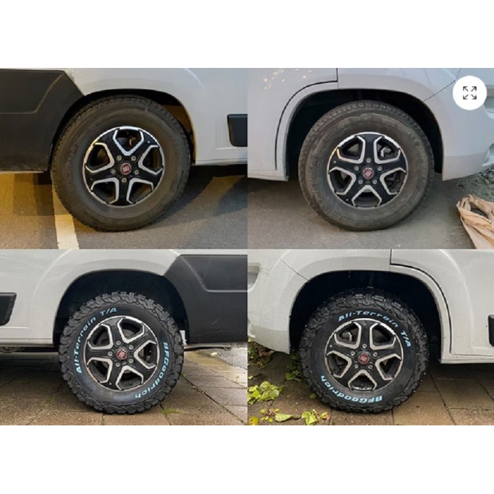 Kit completo con resortes auxiliares traseros para su Fiat Ducato / Citroën Jumper / Peugeot Boxer. Esta suspensión auxiliar también eleva el coche 50 mm en la parte trasera en posición descargada, lo que aumenta la distancia al suelo y le da al coche un aspecto más atractivo. Los resortes son progresivos y se endurecen con cargas más altas. Todos los productos MAD son productos aprobados y probados por el TUV que no afectan a otras partes del coche y están aprobados en la inspección. Este kit es adecuado para aquellos que conducen todo el tiempo con una carga de 350 a 750 kg. Cuando se conduce con 750 kg+, el coche mantiene su altura normal.