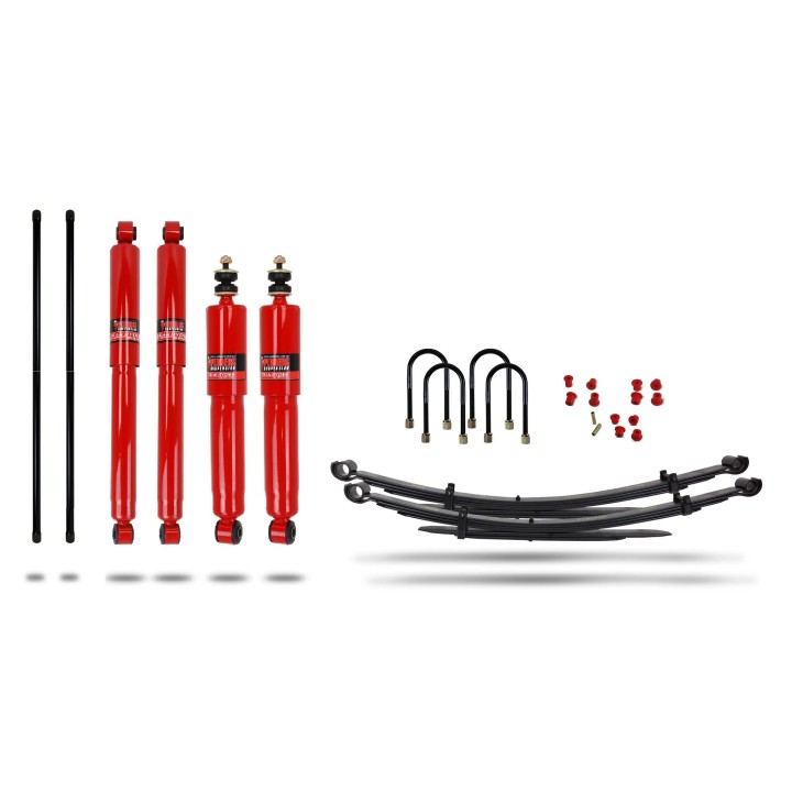 Este kit incluye nuestros excelentes amortiguadores Pedders TrakRyder, barras de torsión delanteras, nuevos muelles de ballesta traseros, así como los casquillos y pernos en U necesarios para instalarlos.