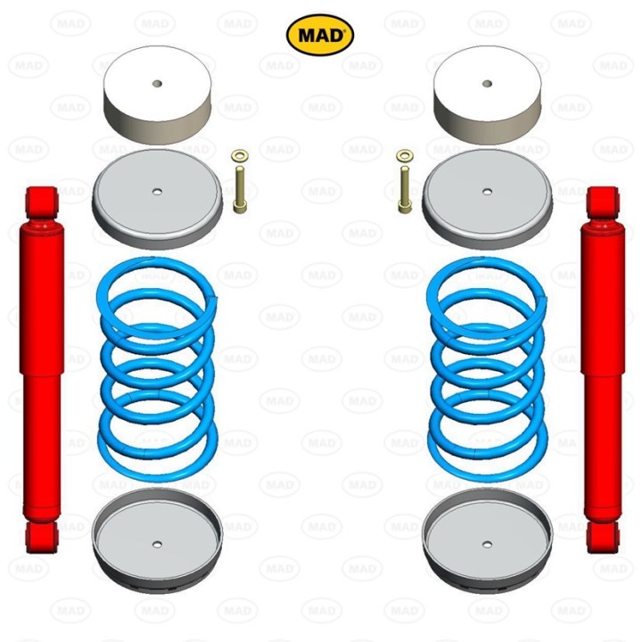 Las cargas pesadas, el remolque y los vehículos equipados con un sistema GLP a menudo alteran considerablemente el comportamiento en carretera. Esto resulta en un mayor riesgo de derrape y balanceo en las curvas, con viento lateral y al adelantar. Los baches, las irregularidades de la calzada y los baches se transmiten con mayor intensidad. Por ello, MAD ha desarrollado muelles de refuerzo. Estos muelles optimizan la fuerza de retorno de la suspensión original, mejorando así la estabilidad del vehículo, el confort y la seguridad. Su instalación es sencilla y puede ser realizada por cualquier taller.