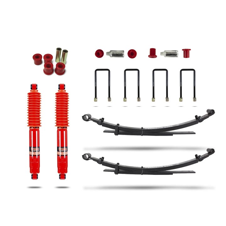 Este kit incluye nuestros excelentes amortiguadores de celda de espuma Trakryder, nuevas ballestas traseras, así como los silent blocks y los pernos en U para instalarlos.