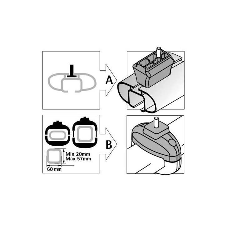Este sistema de abrazadera le permitirá fijar un portaesquís (4 o 6 pares) en sus barras de techo transversales ovales que no tienen ranuras para su instalación.
