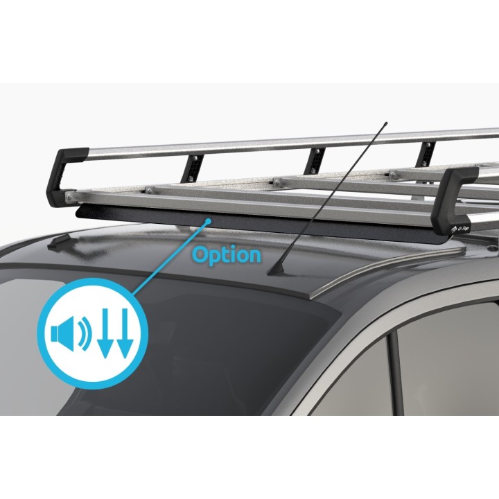 La baca de techo Q-Top O19 es un portacargas de aluminio de alta calidad para profesionales exigentes. La baca de techo está equipada con soportes de acero inoxidable que se adaptan perfectamente a los puntos de montaje originales de su Renault EXPRESS. El Q-Top O19 tiene un diseño distintivo y robusto y está disponible en dos colores: aluminio anodizado plata o con un recubrimiento en polvo negro resistente a los arañazos. Para minimizar el ruido del viento, la barra transversal delantera está equipada con dos difusores de viento. Para una reducción adicional del ruido, puede optar por el alerón delantero opcional (nota: solo disponible en negro). Este alerón delantero se suministra de serie con algunos modelos de coche.