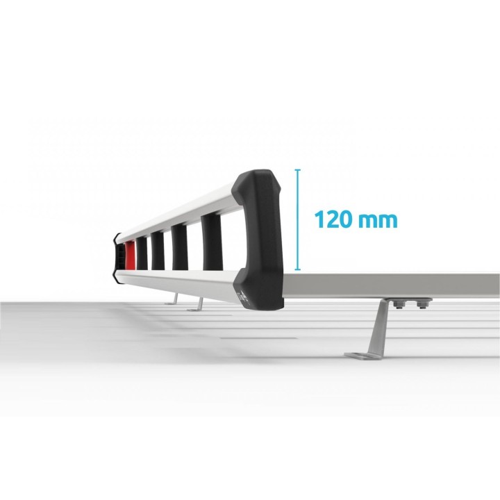 La baca de techo Q-Top O19 es un portacargas de aluminio de alta calidad para profesionales exigentes. La baca de techo está equipada con soportes de acero inoxidable que se adaptan perfectamente a los puntos de montaje originales de su Renault TRAFIC. El Q-Top O19 tiene un diseño distintivo y robusto y está disponible en dos colores: aluminio anodizado plata o con un recubrimiento en polvo negro resistente a los arañazos. Para minimizar el ruido del viento, la barra transversal delantera está equipada con dos difusores de viento. Para una reducción adicional del ruido, puede optar por el alerón delantero opcional (nota: solo disponible en negro). Este alerón delantero se suministra de serie con algunos modelos de coche.