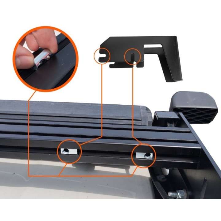 El soporte se monta en los puntos de fábrica proporcionados por el fabricante del automóvil. La plataforma en la parte superior tiene orificios para usar diferentes tipos de asas y ganchos. No interfiere con el techo solar. El carenado delantero reduce muy eficazmente el nivel de ruido.