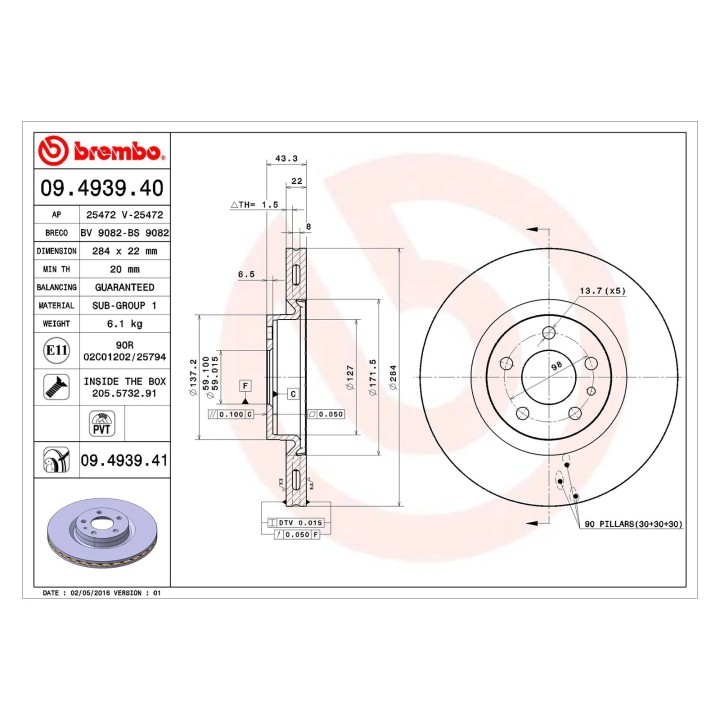 Disco de freno delantero Fiat 500 L 09.2012+ Tornillos de fijación montados BREMBO REF 51937217
