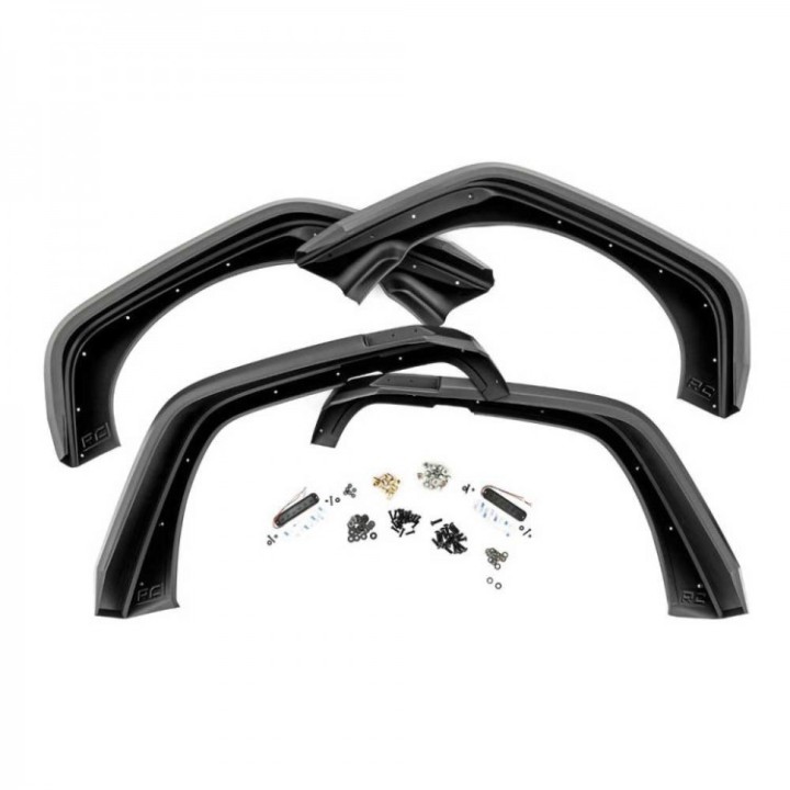 El innovador diseño de las extensiones de guardabarros de Rough Country permitirá montar neumáticos de mayores dimensiones. Estas extensiones de guardabarros de aspecto agresivo protegerán sin duda la carrocería de su Jeep del barro o los escombros de la carretera proyectados por los neumáticos.