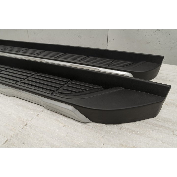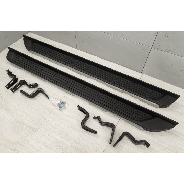 Las diferentes ventajas: Los estribos facilitan la entrada y salida, aumentando así el confort. También proporcionan protección contra arañazos o golpes de puerta. El valor de reventa del vehículo aumenta Diseño exclusivo e individual Apariencia deportiva y dinámica Calidad superior: aluminio de alta calidad Aerodinámica perfectamente adaptada Capacidad de carga por lado 160 kg Fácil carga de las barras de techo No requiere perforación ni soldadura
