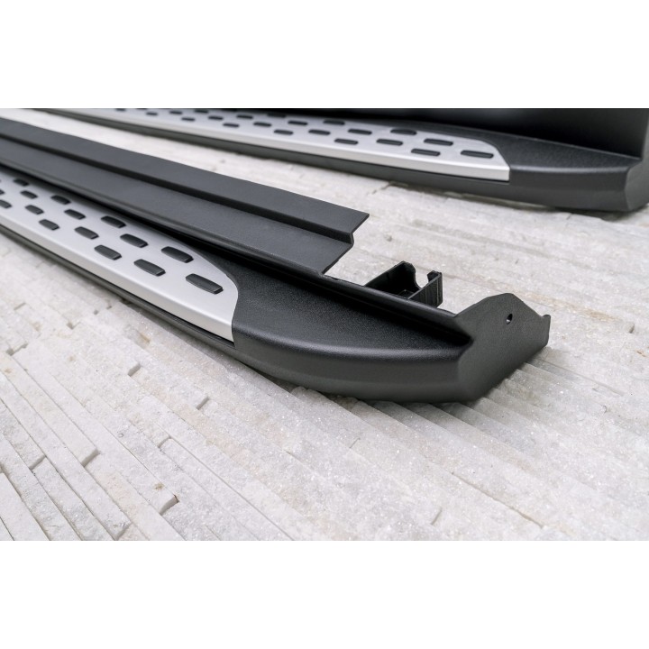 El conjunto incluye un juego de estribos (derecho e izquierdo), elementos de montaje e instrucciones. Los umbrales se montan en los puntos de montaje de fábrica. ¡La instalación de los estribos no requiere perforar agujeros adicionales! Recomendamos un montaje profesional en un taller