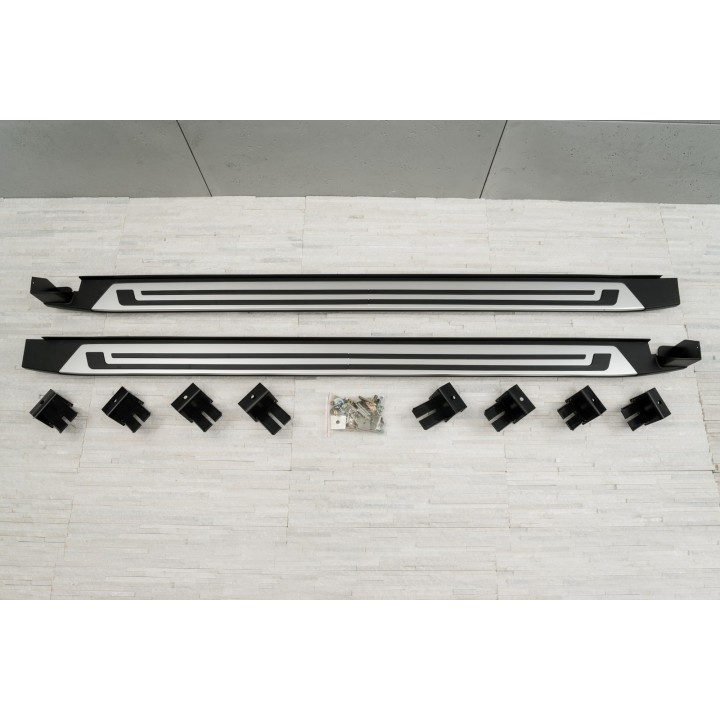 Las diferentes ventajas: Las estriberas facilitan la entrada y salida y aumentan así el confort. También proporcionan protección contra arañazos o golpes de puertas. El valor de reventa del vehículo aumenta Diseño exclusivo e individual Apariencia deportiva y dinámica Calidad superior: aluminio de alta calidad Aerodinámica perfectamente adaptada Capacidad de carga por lado 160 kg Carga fácil de las barras de techo No requiere perforación ni soldadura