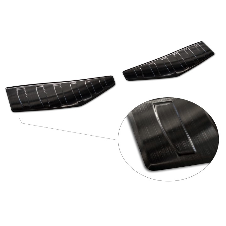 esta protección de umbral de maletero con bordes protege eficazmente contra abolladuras y arañazos durante la carga y descarga. Gracias a su forma, como el patrón de nervaduras en la parte superior, está hecha de tal manera que se adapta perfectamente al diseño del FORD MUSTANG E-MACH. Y si algún día desea reemplazar el protector después de un uso intensivo, también es posible. Será mucho más barato que volver a pintar su parachoques.