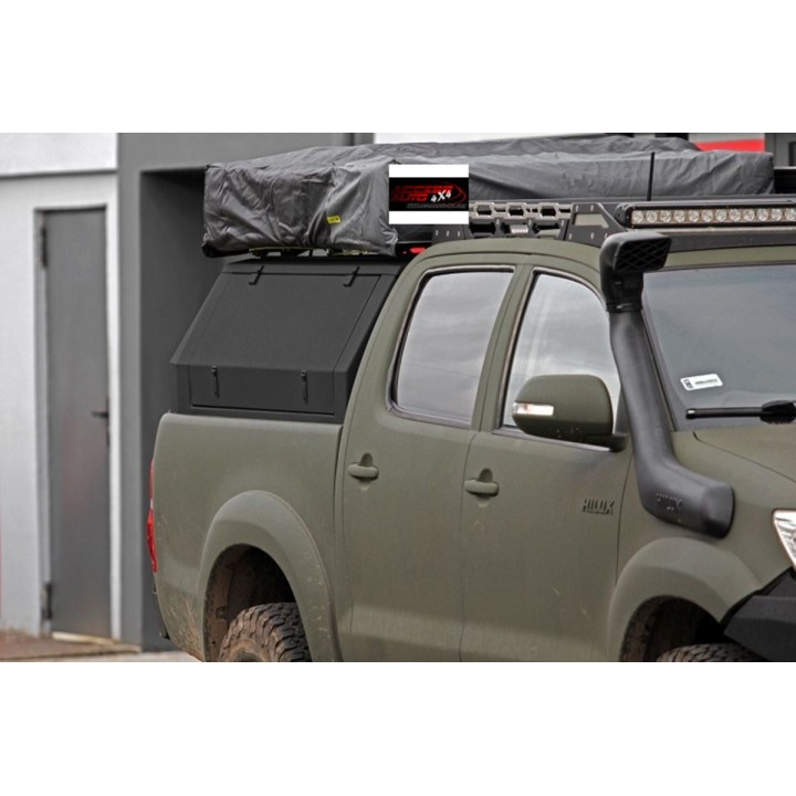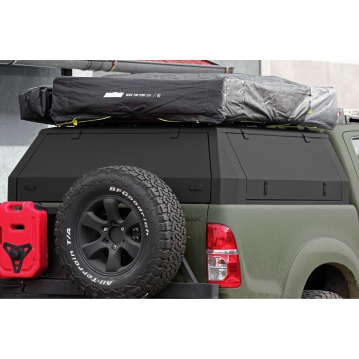 El HARD TOP para TOYOTA HILUX VIGO está fabricado en aluminio de 3 mm de espesor y es una estructura autoportante. Su borde superior y sus potentes postes de esquina constituyen una base sólida para el montaje de barras de techo o tiendas de campaña en el techo rígido, lo que a menudo es imposible en el caso de estructuras compuestas debido a su baja resistencia. Para facilitar la instalación de portaequipajes o tiendas de techo en el HARD TOP, hemos previsto rieles con orificios de fijación que permiten un ajuste de altura de los elementos atornillados.