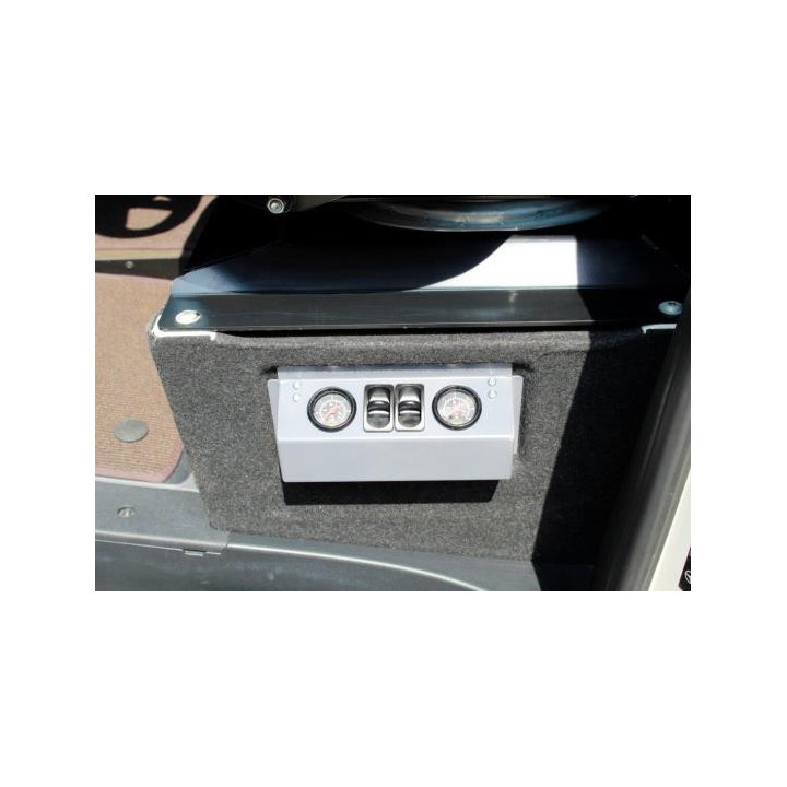 Kit compresor de doble circuito: incluye el material de montaje adicional (manguera de aire, racores en T, etc.), un compresor de 45 litros y un panel de control doble en cabina, lo que permite controlar fácilmente los resortes neumáticos desde la cabina. Ambos fuelles se pueden inflar independientemente a la presión máxima y desinflar a la presión mínima. Esto permite equilibrar las diferentes cargas y garantizar la estabilidad del vehículo en las curvas.