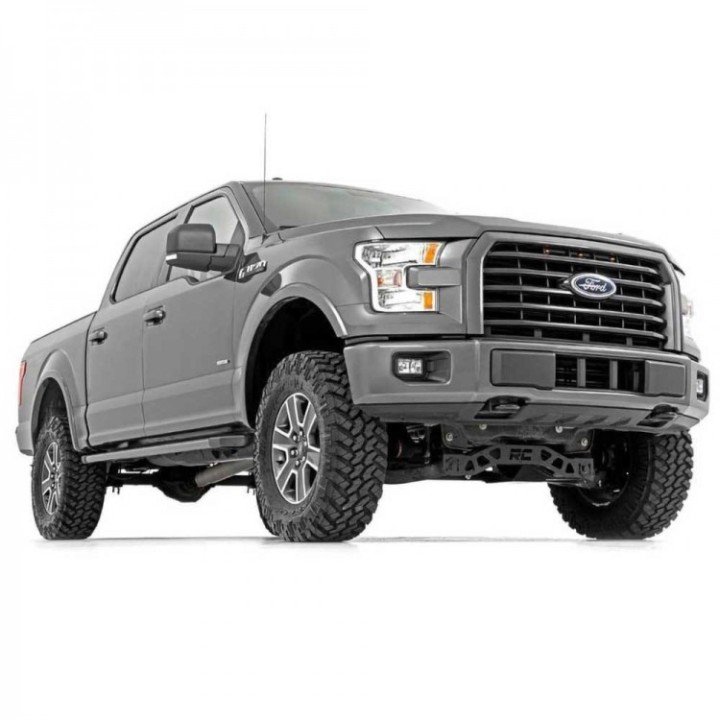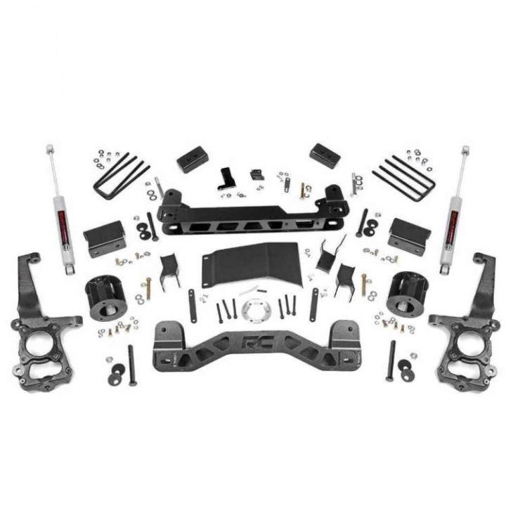Dele a su Ford F-150 un nuevo aspecto agresivo y un rendimiento todoterreno inigualable con la suspensión de 4 pulgadas de Rough Country. Este kit todo incluido tiene todo lo necesario para sacar su Ford de la carretera y llevarlo al campo. Con un juego de manguetas y espaciadores de puntal duraderos, ganará suficiente altura libre para usar neumáticos de hasta 33" con un espaciado de ruedas adecuado. Un juego de soportes de diferencial, soportes de barra estabilizadora, soportes de línea de freno y un espaciador de eje de transmisión ayudan a mantener todo en ángulos óptimos para una conducción como de fábrica, incluso después de la elevación. Un travesaño delantero y trasero de chapa de acero de 1/4 de pulgada de espesor aporta una resistencia sin concesiones y un aspecto atractivo a su camioneta, y está actualizado para adaptarse al nuevo F-150. Nuestros bloques traseros fabricados ofrecen considerablemente más resistencia que sus homólogos de fundición y han sido especialmente diseñados por Rough Country para evitar el enrollamiento del eje. También se incluye en este kit un juego de amortiguadores todoterreno N3 de primera calidad de Rough Country, que cuentan con un cuerpo de gran diámetro con un vástago de pistón endurecido con cromo y bujes de poliuretano de larga duración.