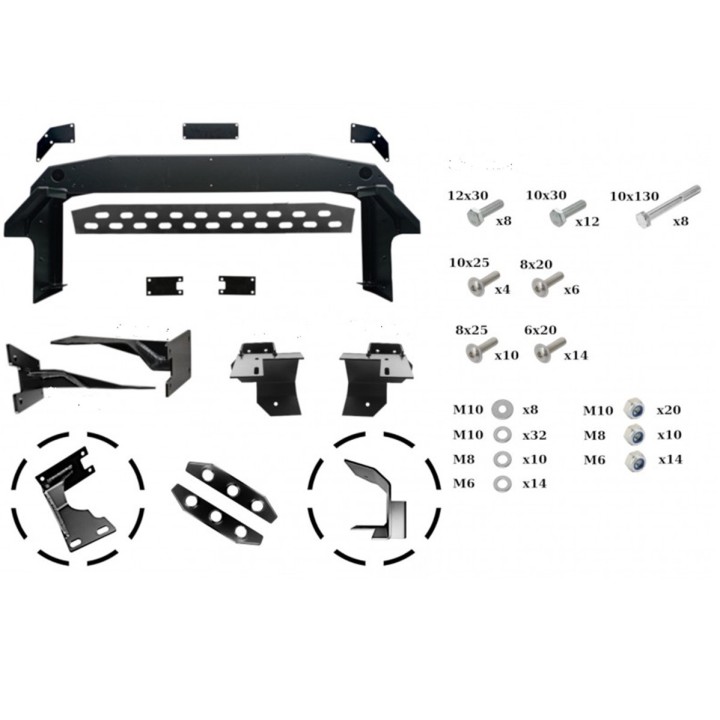 El conjunto incluye un parachoques, soportes de montaje principales, soportes de montaje laterales del parachoques y