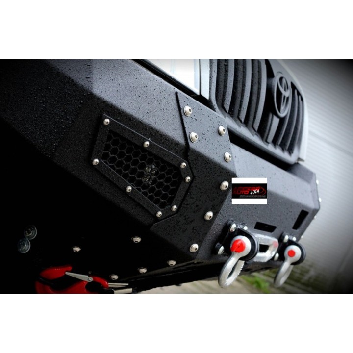 - El parachoques está equipado con dos soportes integrados para luces diurnas o antiniebla, fijaciones reforzadas para soportes de grillete y una placa de soporte de cabrestante integrada (posibilidad de instalar un cabrestante de 4 a 5000 kgs).