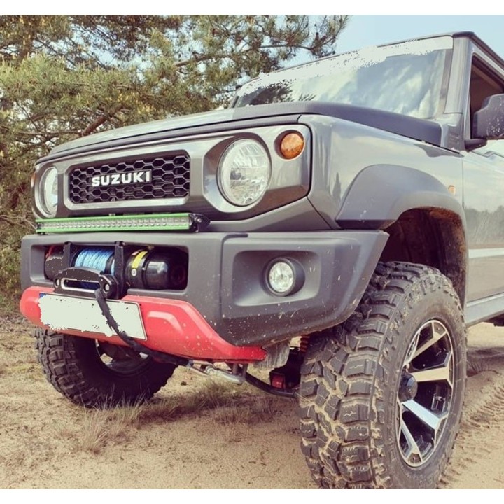 Suzuki Jimny 2018- Placa de montaje del cabrestante debajo del parachoques original. Diseñado para cabrestantes con una fuerza de remolque de hasta 6000 kgs. Fabricado en chapa de acero estructural de 6 mm de espesor. Granallado y termolacado según una tecnología de dos capas con estructura. El montaje no requiere perforación ni soldadura. Peso 8,9 kg. El cabrestante de este modelo está oculto en la parte superior del parachoques y el pasacables se inserta en la rejilla de entrada del parachoques. Dicha ubicación permite la instalación de un cabrestante con un motor grande y largo.