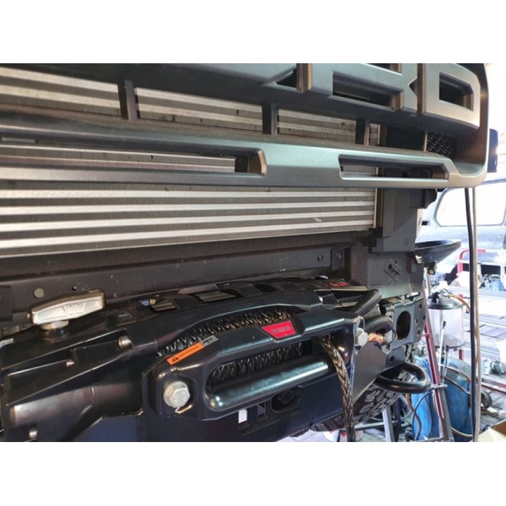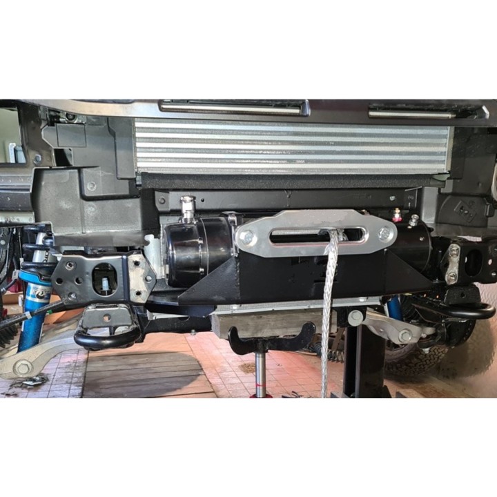 Ford Ranger Raptor 2019-2022: Placa de montaje del cabrestante HD debajo del parachoques original. Fabricado en chapa de acero de construcción de 6 mm de espesor. Granallado y termolacado en tecnología de doble capa con estructura. El montaje no requiere soldadura, perforación ni pernos adicionales. Apto para elevadores de hasta 6500 kgs. En este tipo de plataforma, el cabrestante debe montarse horizontalmente y girado 180 grados, de modo que el motor quede en el lado izquierdo del coche y el cable se enrolle hacia arriba en el tambor. Peso aprox. 12,5 kg.